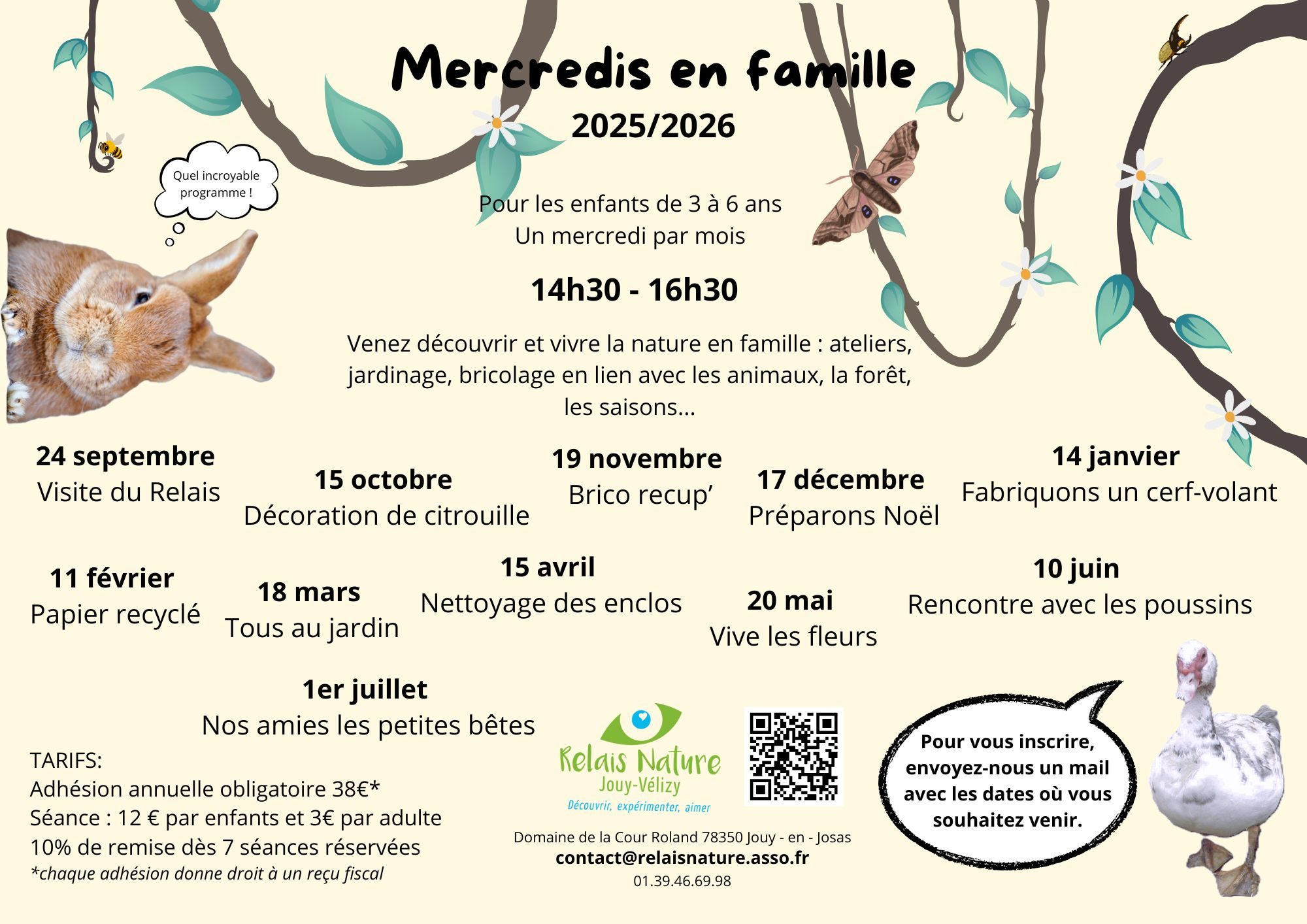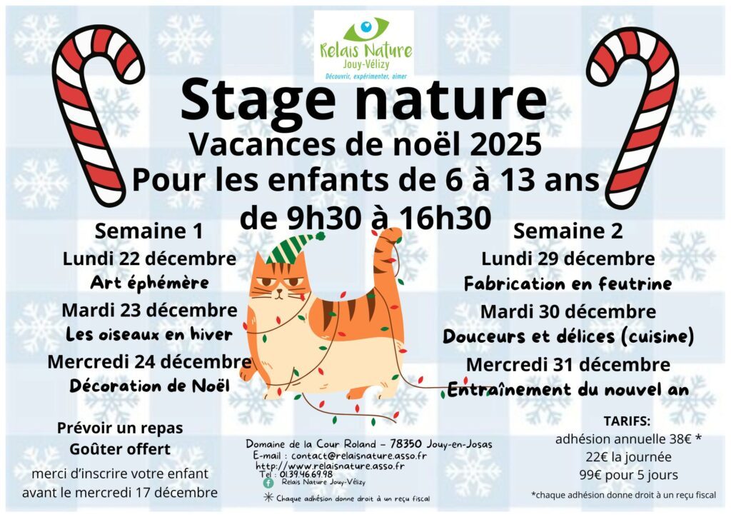 - Du lundi 22 au mercredi 24 décembre et du lundi 29 au mercredi 31 décembre : stages individuels à destination des 6-13 ans, pendant les vacances scolaires de Noël, de 9h30 à 16h30 sur le site du Relais Nature de la Cour Roland.