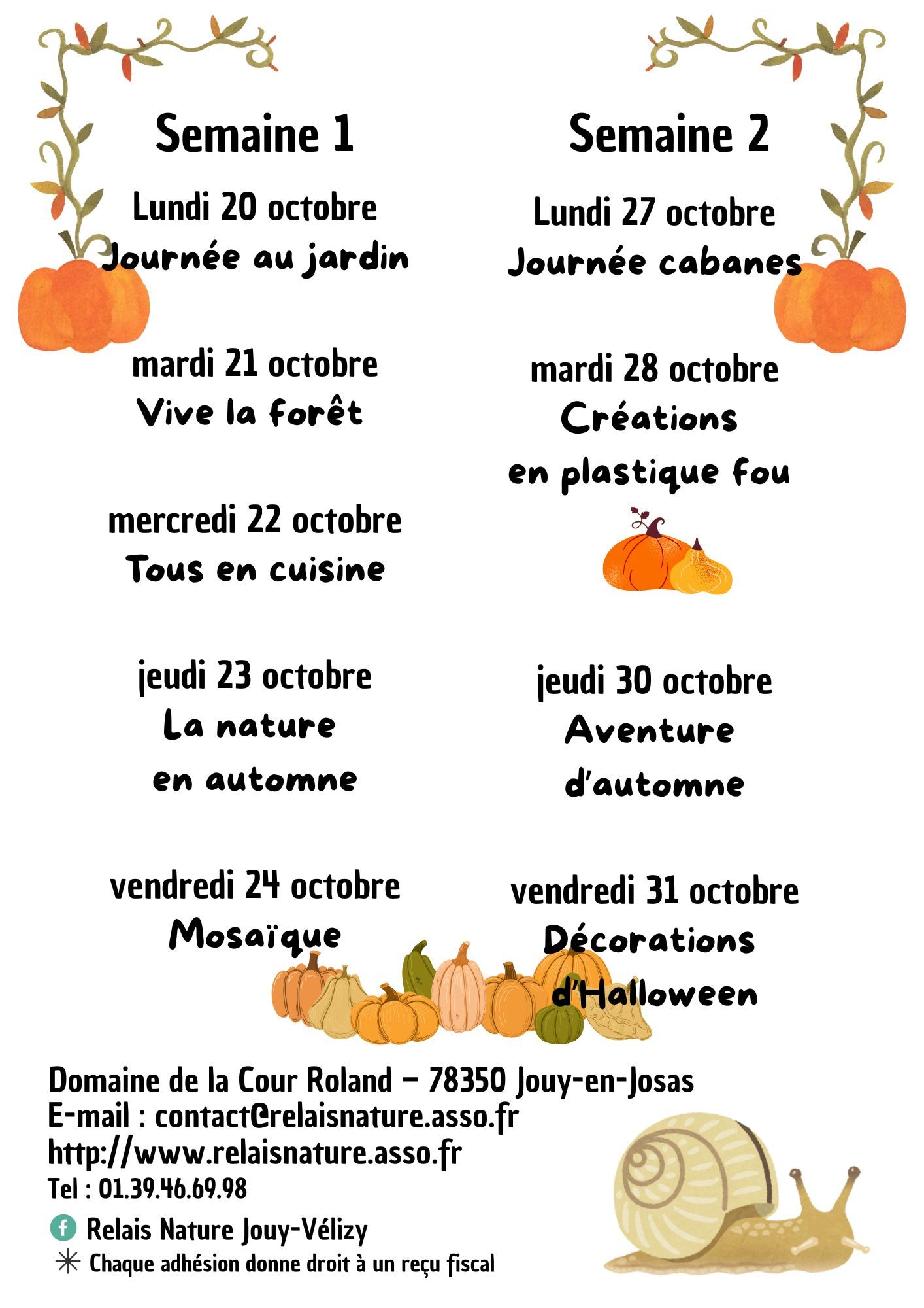 - Du lundi 20 octobre au vendredi 31 octobre: stages individuels pendant les vacances scolaires d’automne, les jours ouvrés (sauf mercredi 29/10) de 9h30 à 16h30 sur le site du Relais Nature de la Cour Roland, à destination des 6-13 ans. Programme ci-dessous; à bientôt !