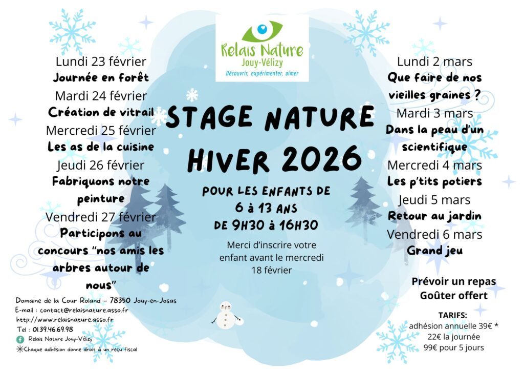 - Du lundi 23 février au vendredi 6 mars : stages individuels à destination des 6-13 ans, pendant les vacances scolaires d’hiver, les jours ouvrés de 9h30 à 16h30 sur le site du Relais Nature de la Cour Roland.