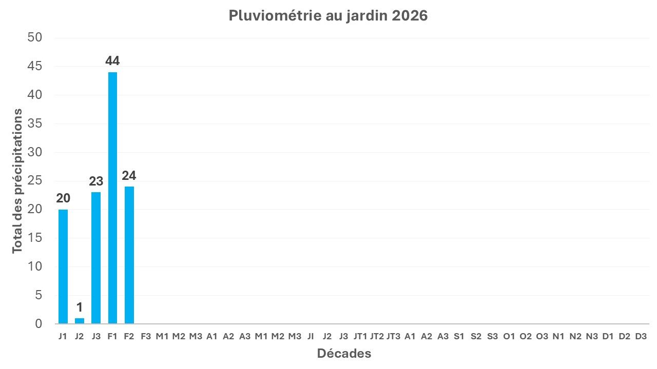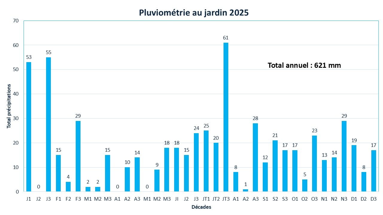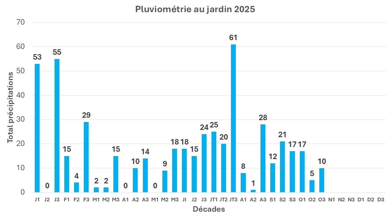 Un pluviomètre est installé depuis quelques années sur une parcelle de notre jardin. Il est relevé pratiquement chaque jour et les valeurs de hauteur d’eau sont notées puis intégrées à un fichier, par décades. Nous vous livrons les résultats en direct.